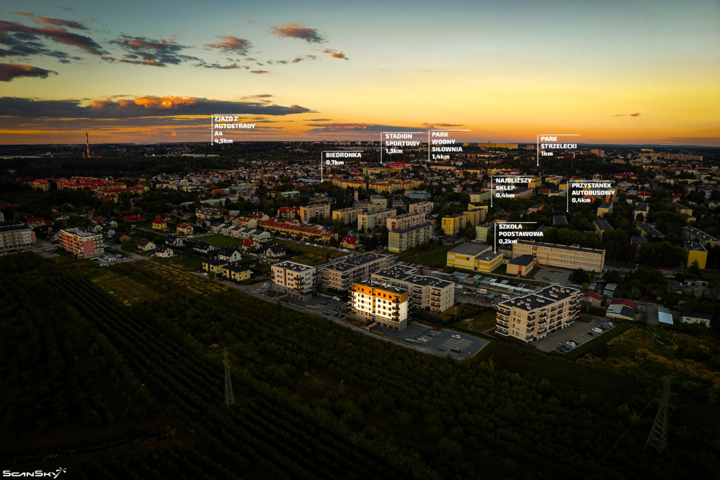 Materiały pozyskane dronem umożliwiają pełne wykorzystanie kluczowych elementów przestrzennych atrakcyjnych dla danej lokalizacji jak np.: najbliższe sklepy, parki, szkoły, czy ciągi komunikacyjne.